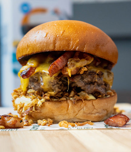 Freshly rolled Handsome beef patty, crispy onions, crispy bacon, double cheese withhome made handsome sauce served on a potato roll