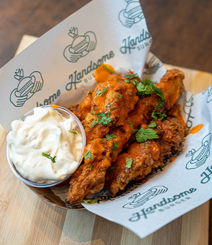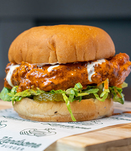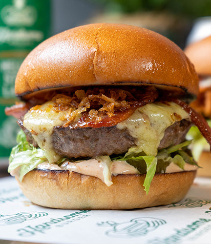 Freshly rolled Handsome beef patty, streaky bacon, smoked cheese, pickles, lettuce, crispy onions and a spicy chipotle sauce served on a potato roll.