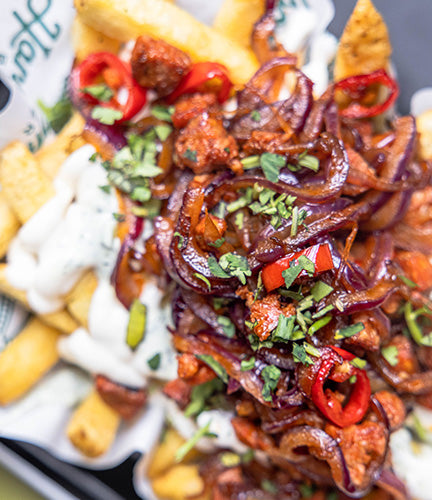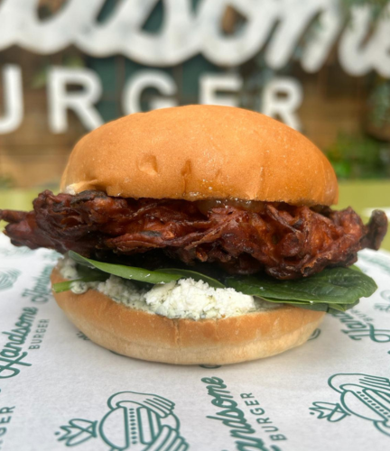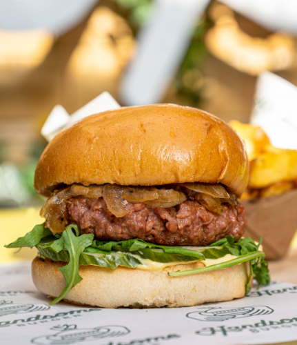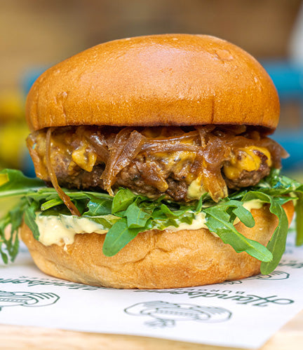 Beyond meat patty, sticky onions, pickled cucumber, rocketand homemade handsome sauce served on a vegan bun