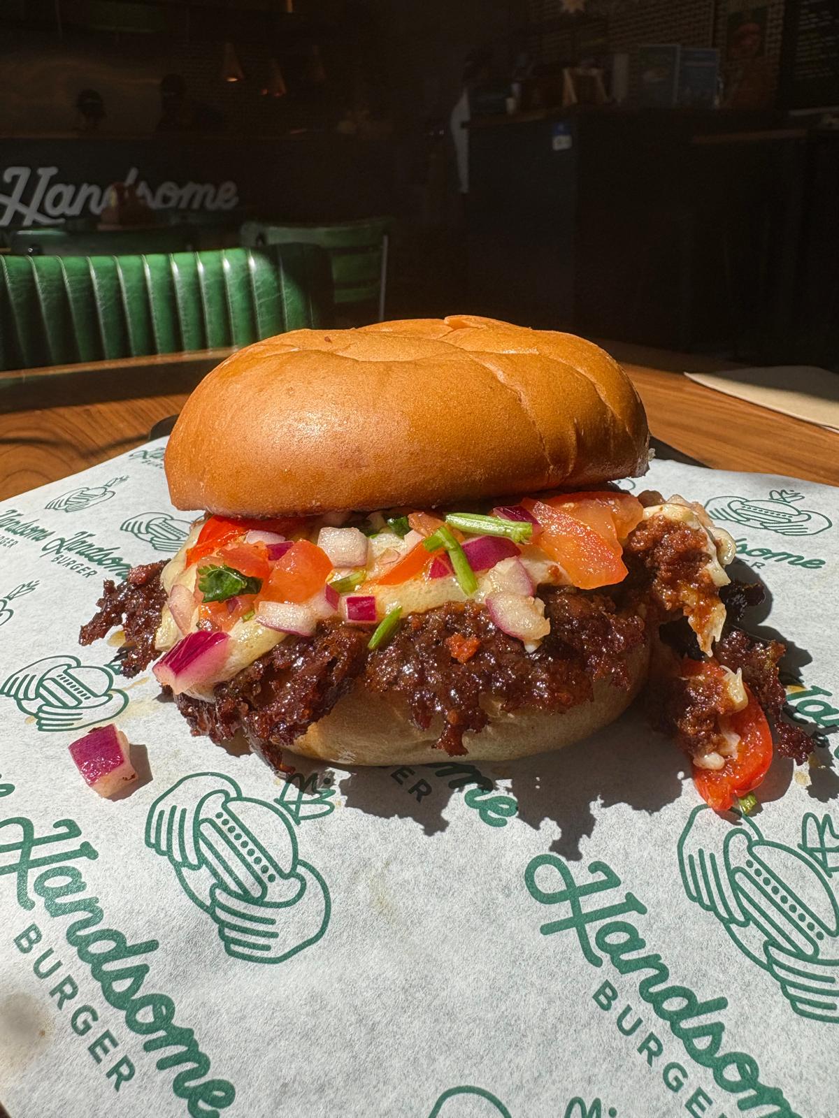 Freshly rolled Handsome beef patty, sticky onions, pickled cucumbers, Rocket and homemade handsome sauce served on a potato roll.