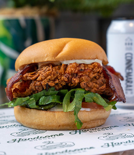 Buttermilk fried chicken, crispy smoked bacon, handsome pickles, tomato, lettuce and drizzled with a lemon and herb mayo served on a potato roll.