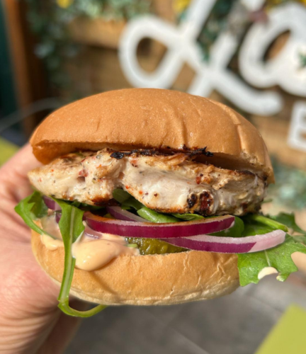Grilled chicken breast, pickles, rocket, red onions and sriracha mayo served on a potato roll